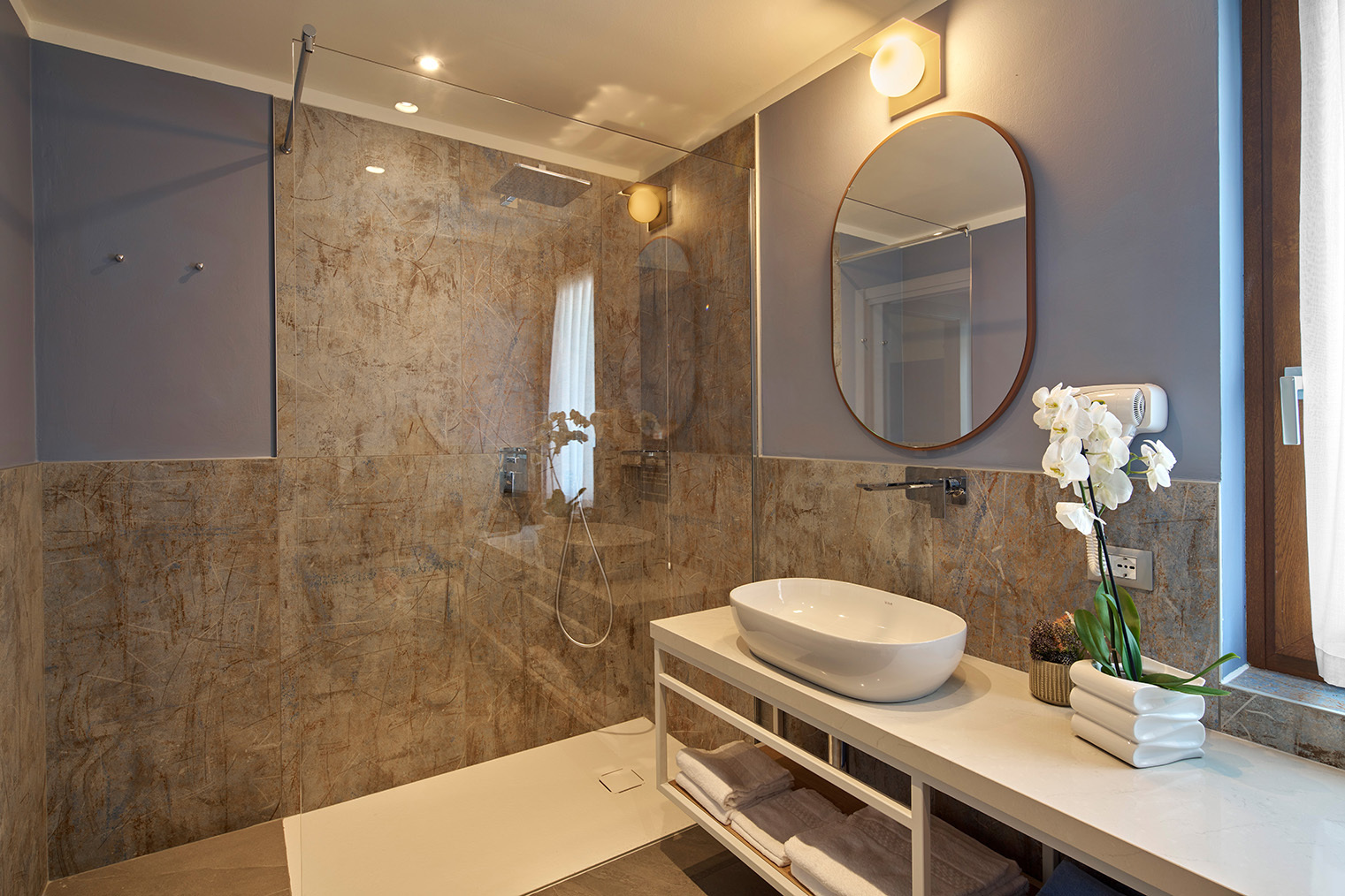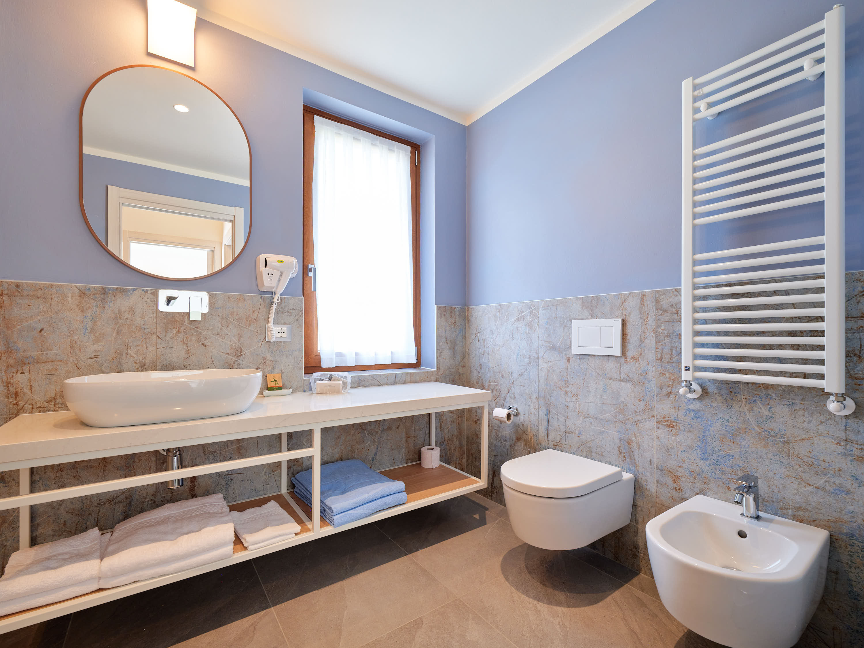 Arredato in stile moderno, dotato di ogni comfort, come il luminoso soggiorno con divano letto e tv, e la cucina completamente attrezzata con tutto il necessario: utensili, piatti, posate, lavastoviglie, frigorifero, forno a microonde, macchia del caffè e tostapane.