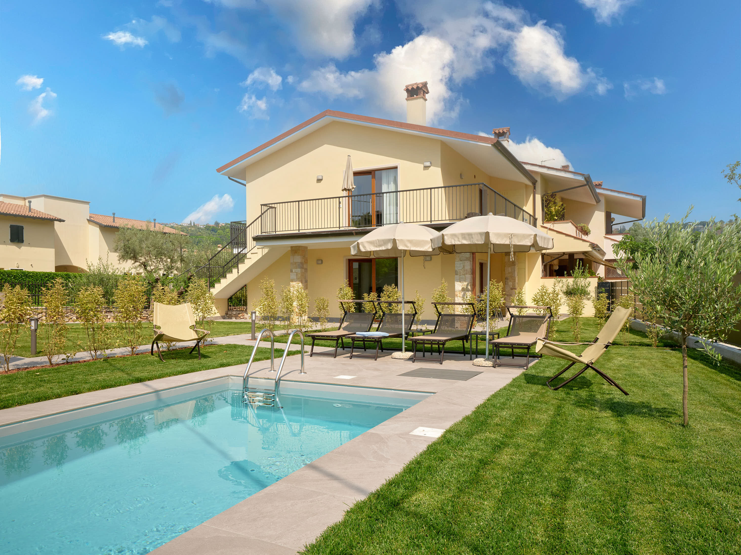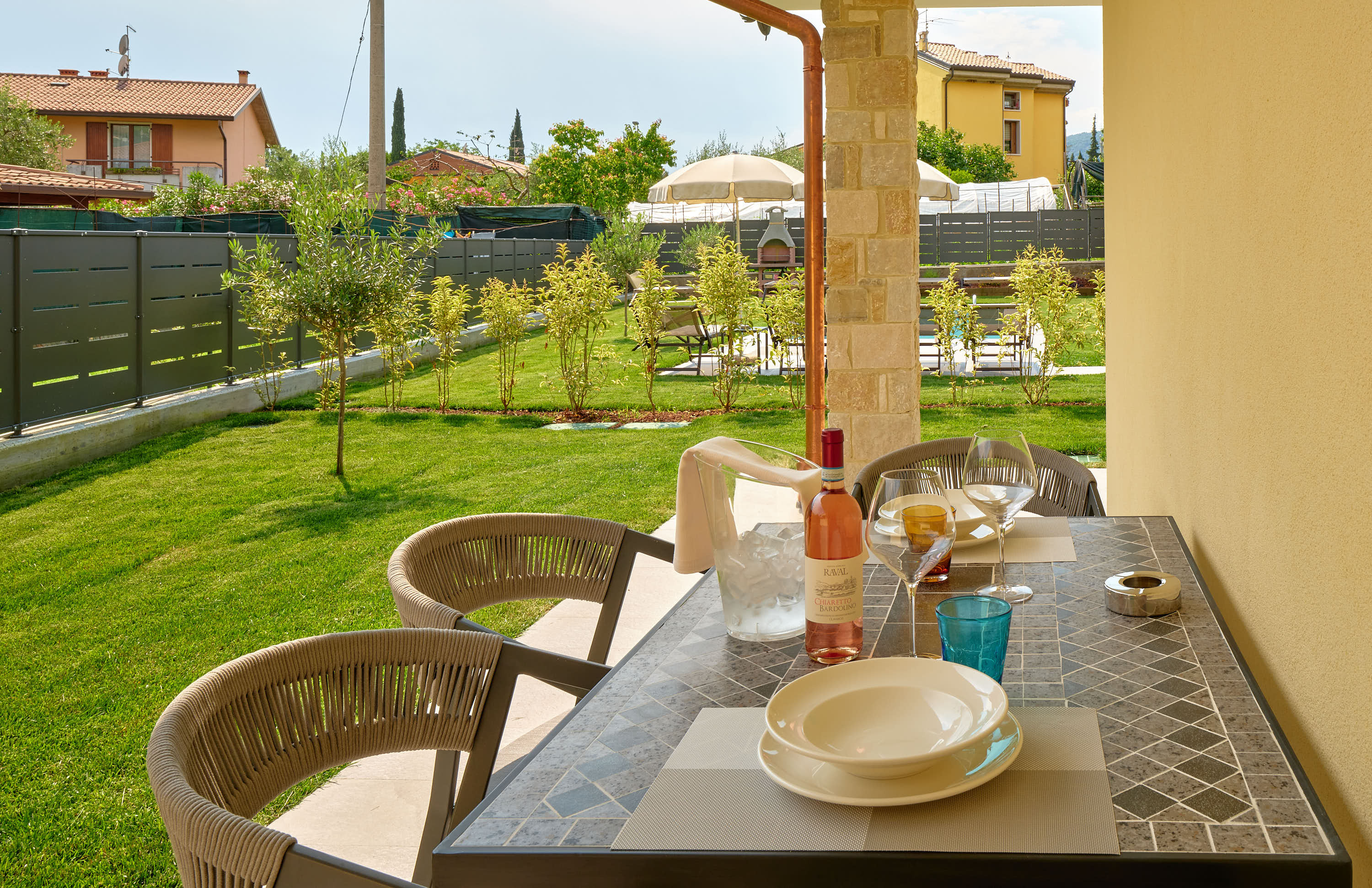 All’esterno, un patio mobiliato, piscina , ampio giardino e zona barbecue.