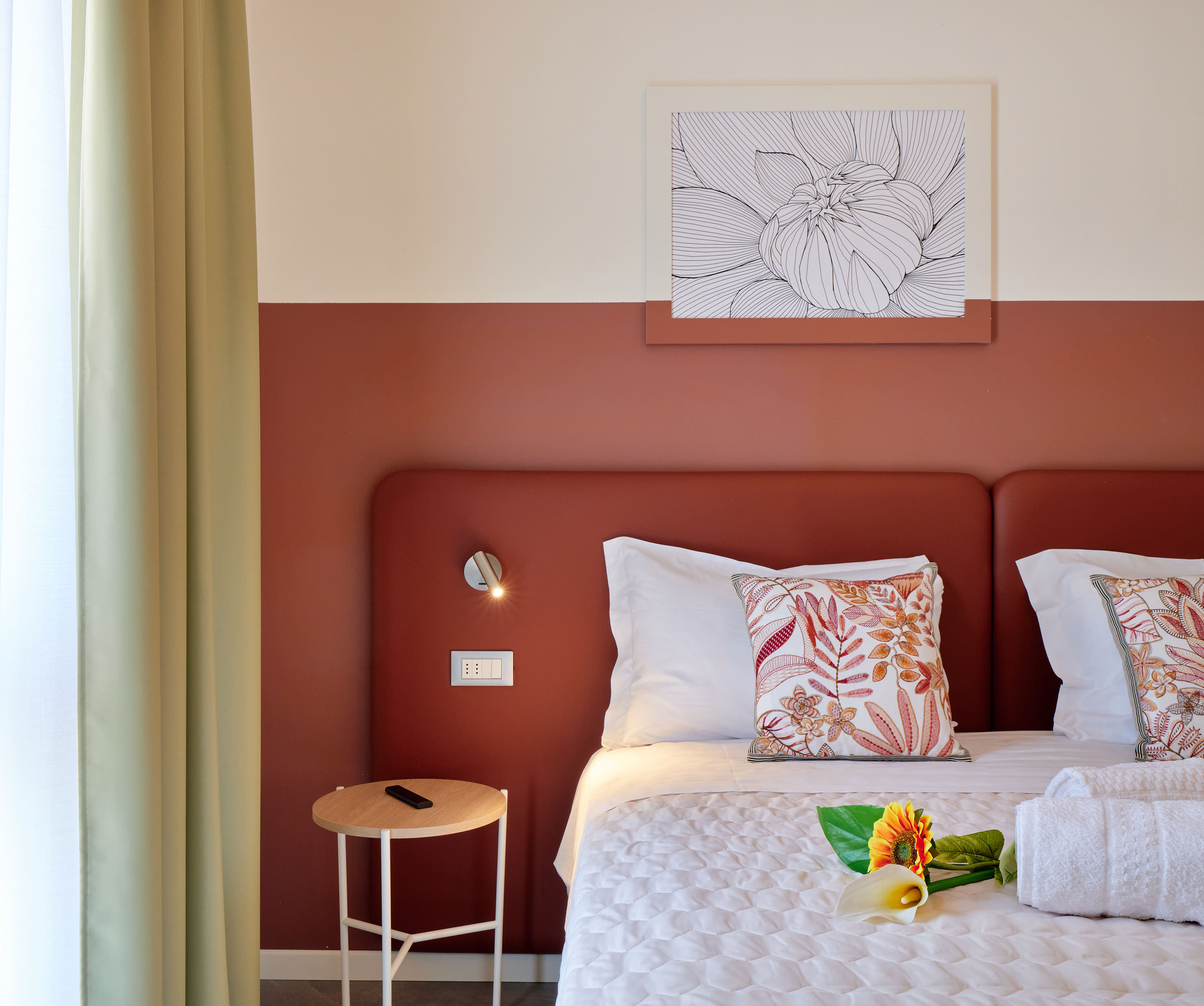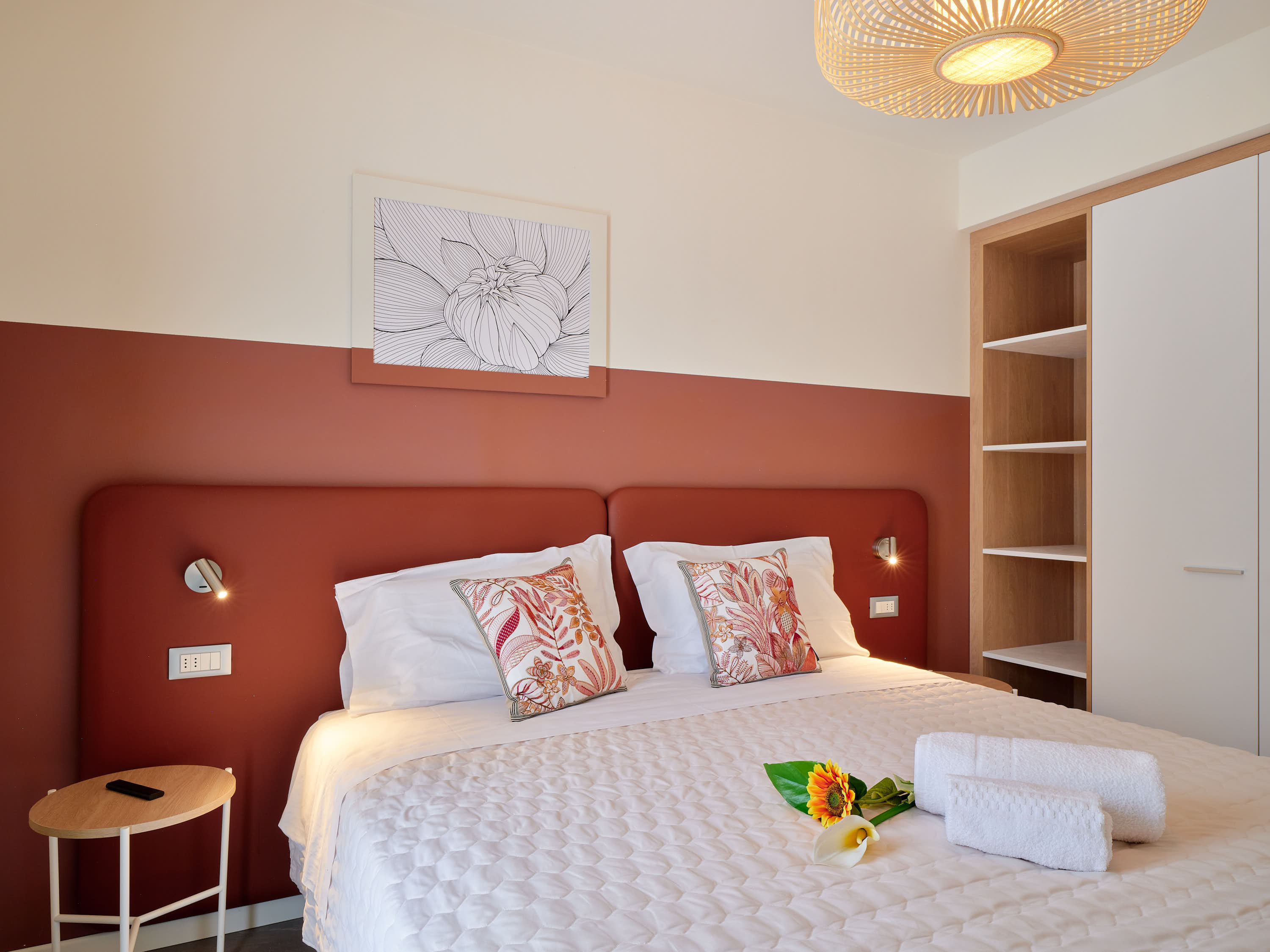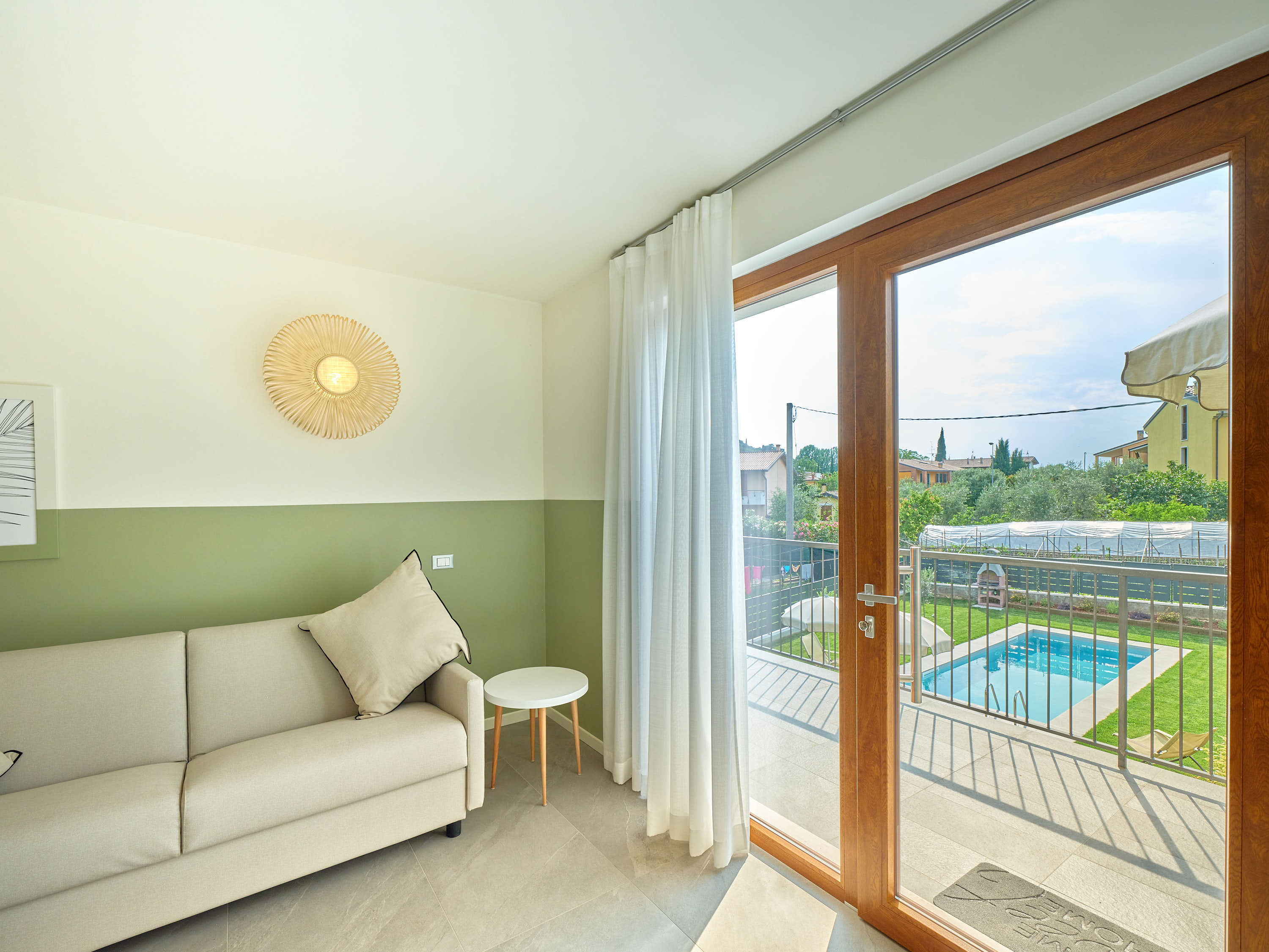 L’Appartamento, luminoso, situato al primo piano con vista panoramica sulla rocca di Garda, il giardino e la piscina. Arredato in stile moderno, dotato di ogni comfort, come il luminoso soggiorno con divano letto e tv, e la cucina completamente attrezzata con tutto il necessario: utensili, piatti, posate, lavastoviglie, frigorifero, forno a microonde, macchia del caffè e tostapane.