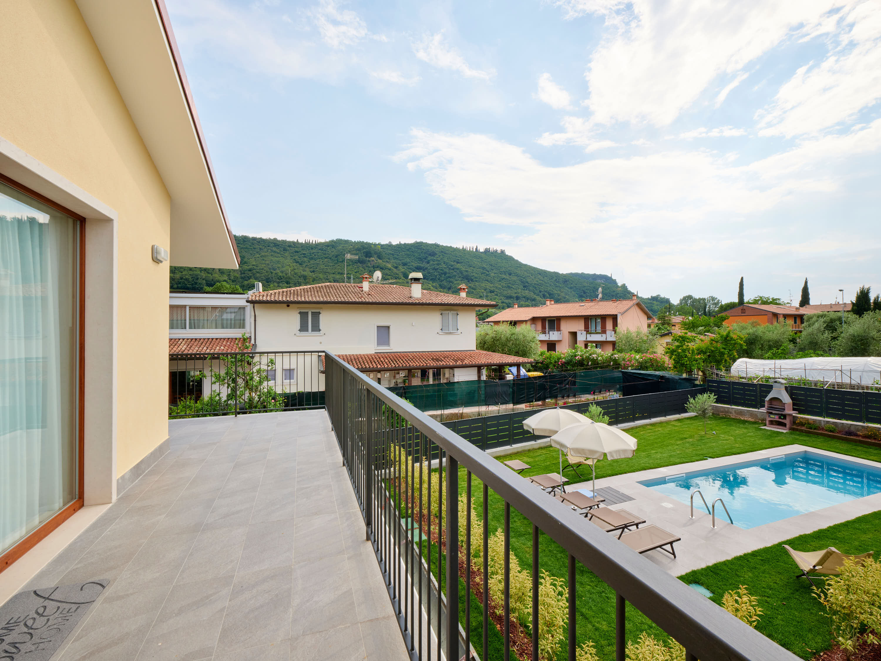 All’esterno, un patio mobiliato, piscina , ampio giardino e zona barbecue.